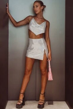Jaws will drop when you strut by in our super hot Aleigh crop top. We are obsessed with its open back and chain straps. Perfect for a glam girls’ night out at your fave rooftop bar. Team it with platform heels and its matching mini skirt for a look that will turn heads.