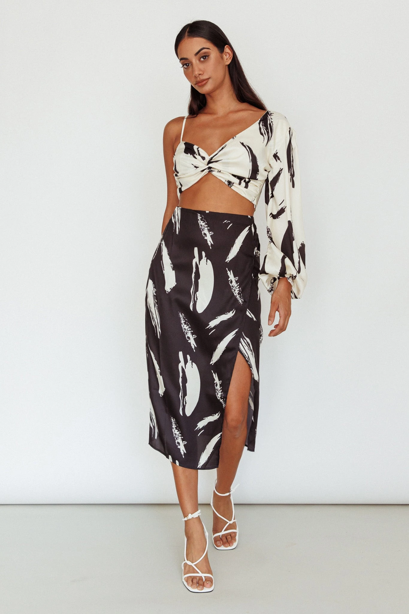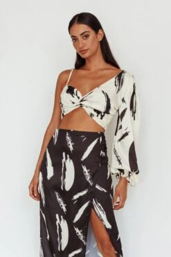 Turn heads in our gorgeous Amina crop top. We are loving its chic, one long sleeve style and twist detail in the bust. Perfect for weekend dinner dates teamed with its matching skirt and mules for a look we are loving.