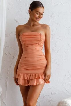 Annabella Strapless Tied Back Frill Hem Mini Dress Peach