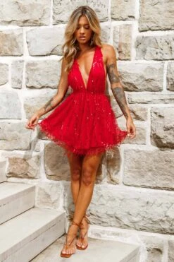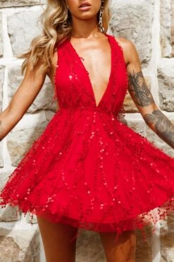 This dress should come with a warning because it is HOT. Featuring the prettiest, red-metallic sequins, plunging neckline and strappy back, our Ariana dress is the perfect party dress. Pair it with strappy heels and a clutch and get ready to steal the show.