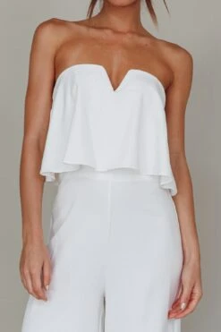 You’ll be unforgettable in our pretty Butterfly Kiss jumpsuit. Featuring a chic, wide ruffle in the bust and strapless style, it’s perfect for a rehearsal dinner or courthouse wedding! Team it with pointed pumps and pearl jewelry for an elegant look.