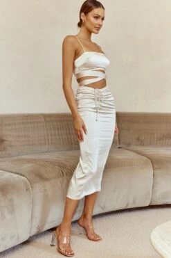Desert Skies Ruched Drawstring Satin Midi Skirt Champagne