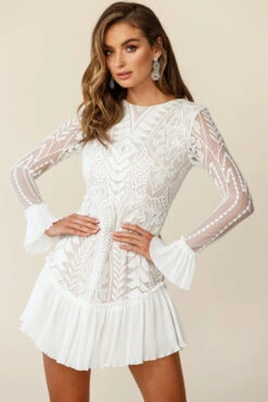 Stop whatever you are doing and take a moment to behold the beauty that is our bestselling Dreamy dress; now in a long sleeve style! Partially lined, it features long sleeves with ruffle cuffs, gorgeous embroidered-mesh overlay, and a flirty ruffle hemline. This dress has it all! Pair it with simple nude heels because this dress is already perfection.