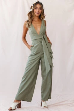 Dylan V-Neckline Wide Leg Jumpsuit Olive