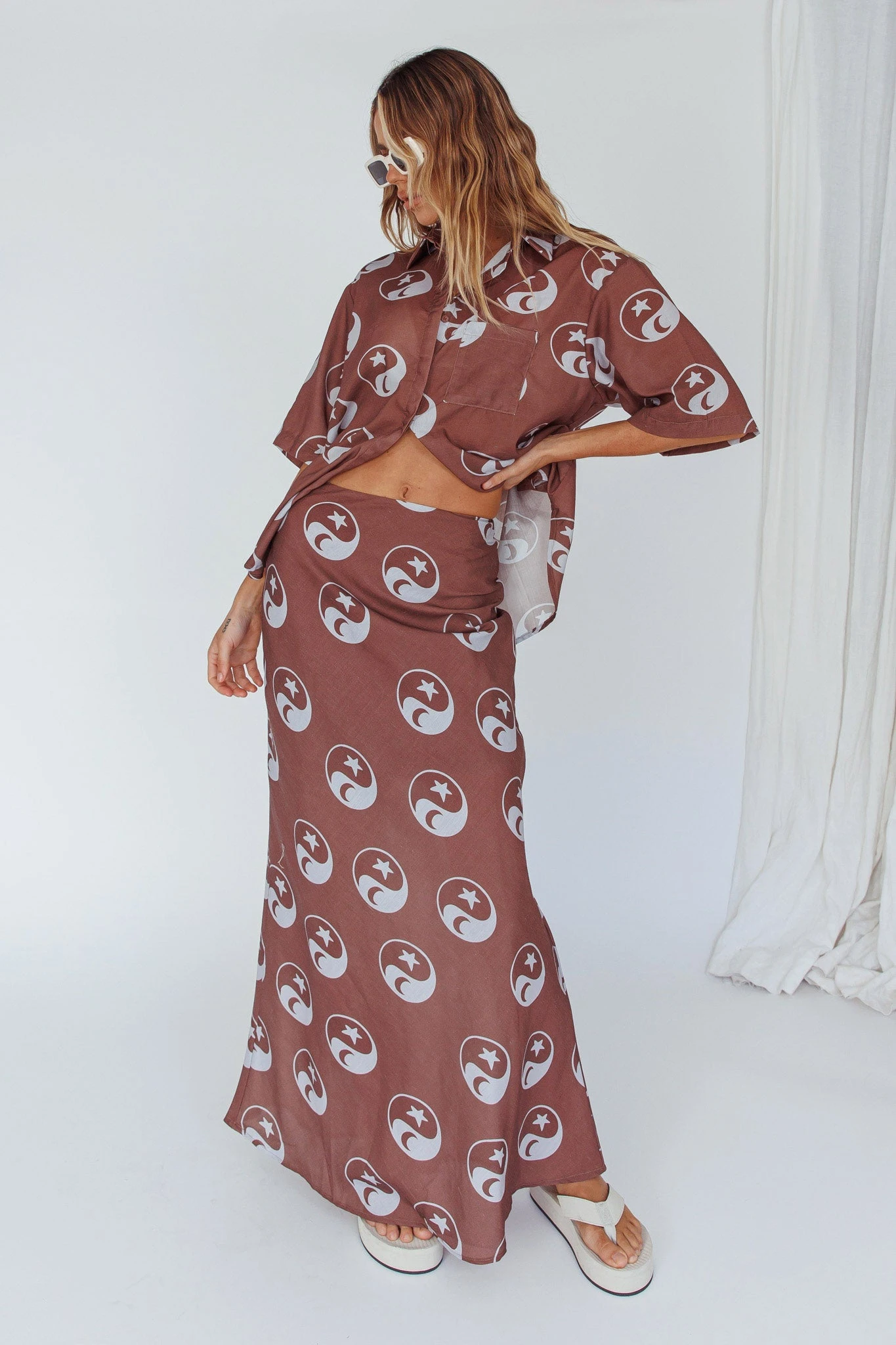 Hey there, cutie! We are loving the print on our Just A Hunch shirt. Perfect for weekend brunch dates with your besties, it looks super cute paired with its matching skirt or wear it with denim shorts and mules for a look we are loving.