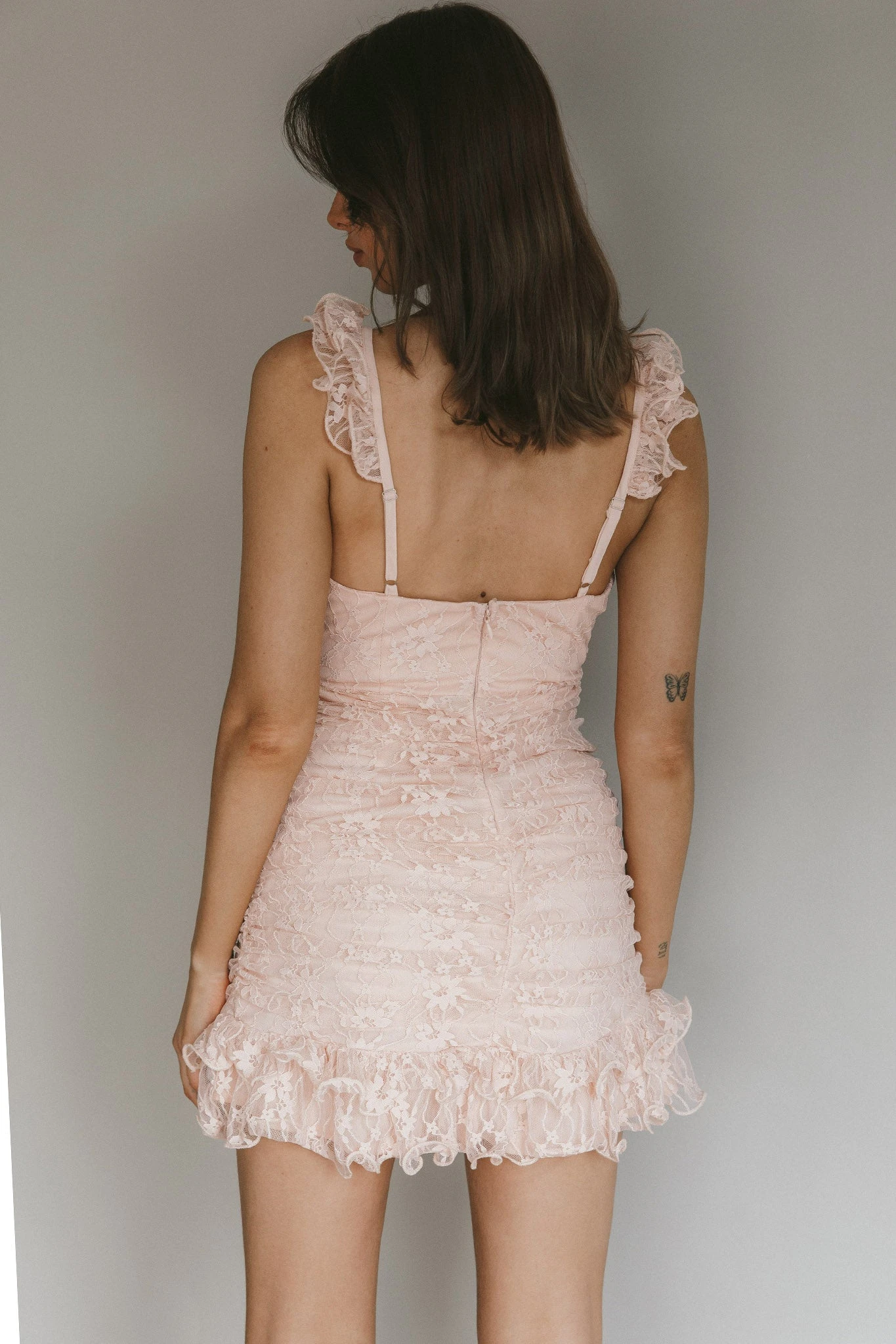 Kaley Ruched Side Layered Frill Hem Lace Mini Dress Blush