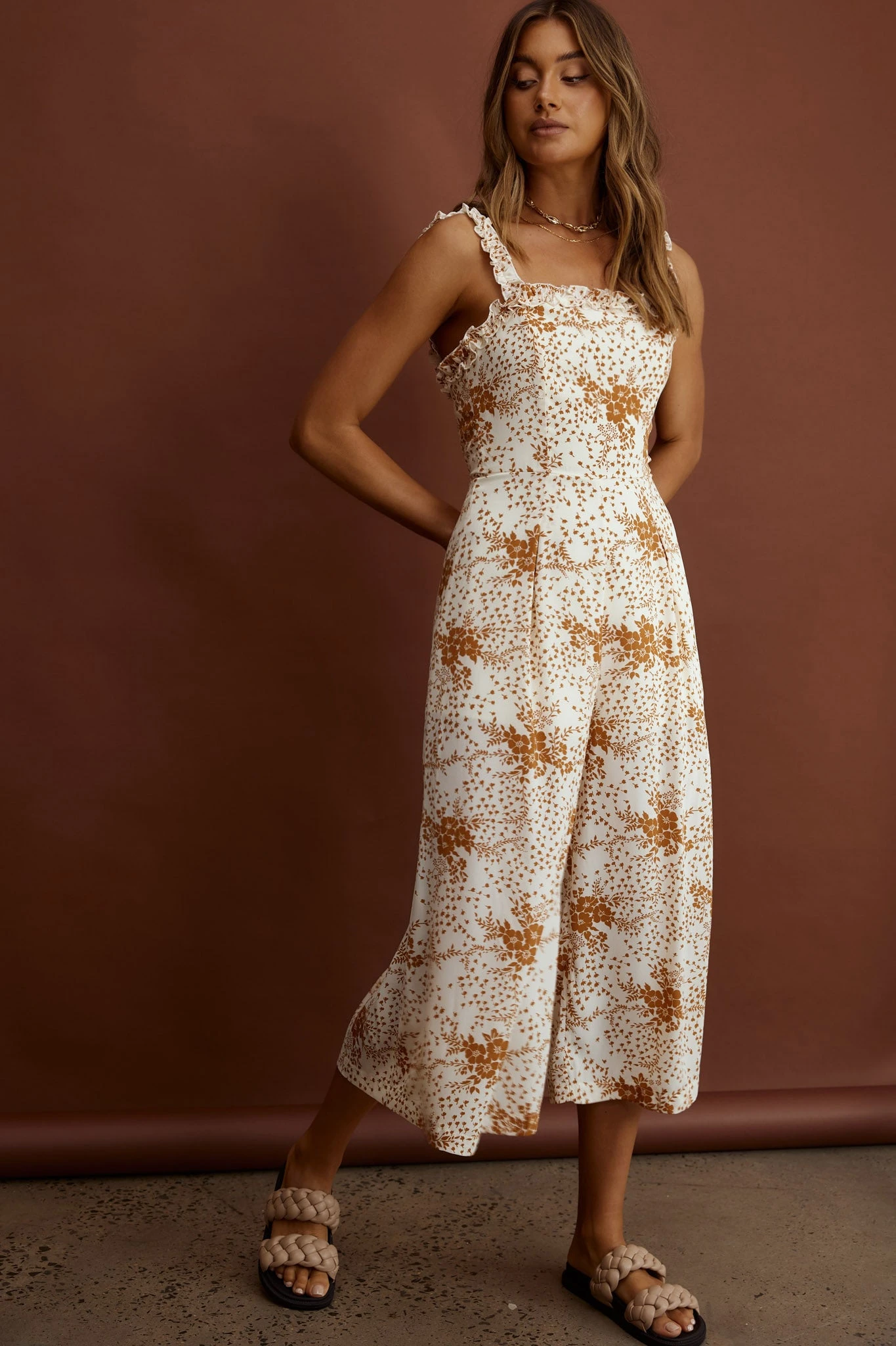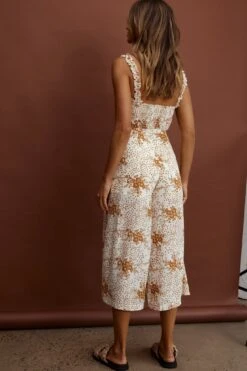 - Tan, floral jumpsuit