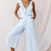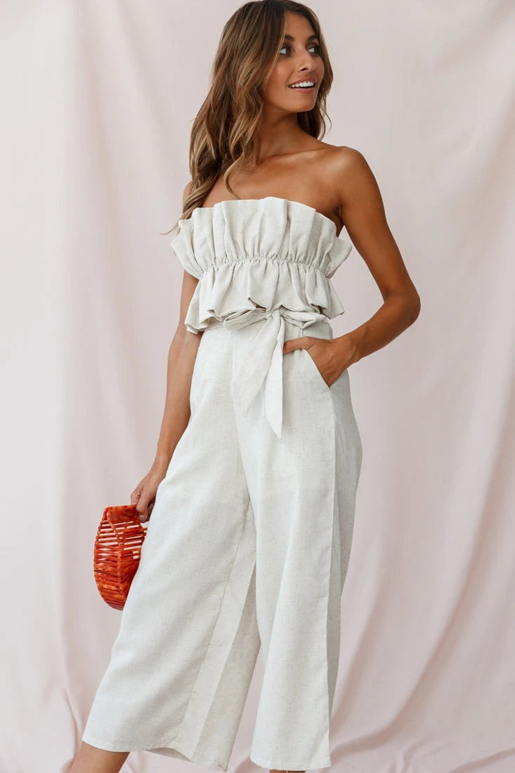 Shoulders are the new cleavage and this super cute strapless jumpsuit is all you need to stay in the style game. A bandeau style, featuring ruffle trims and a tie back, this jumpsuit is super versatile and hot, hot, hot! For a casual-chic look, pair it with some wedges and watch heads turn as you strut by.