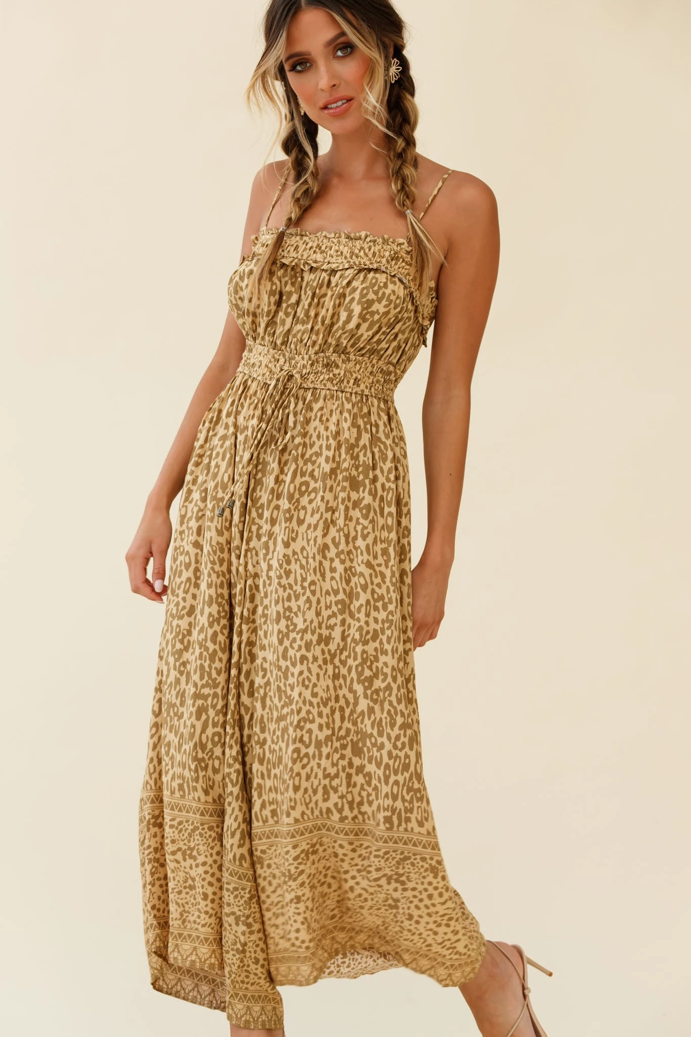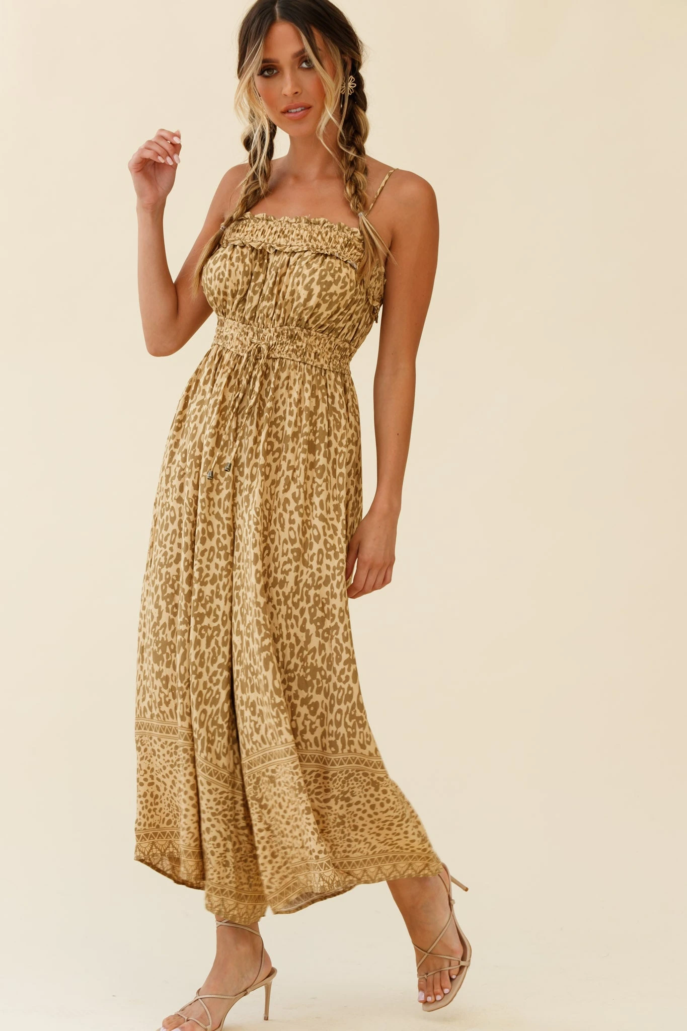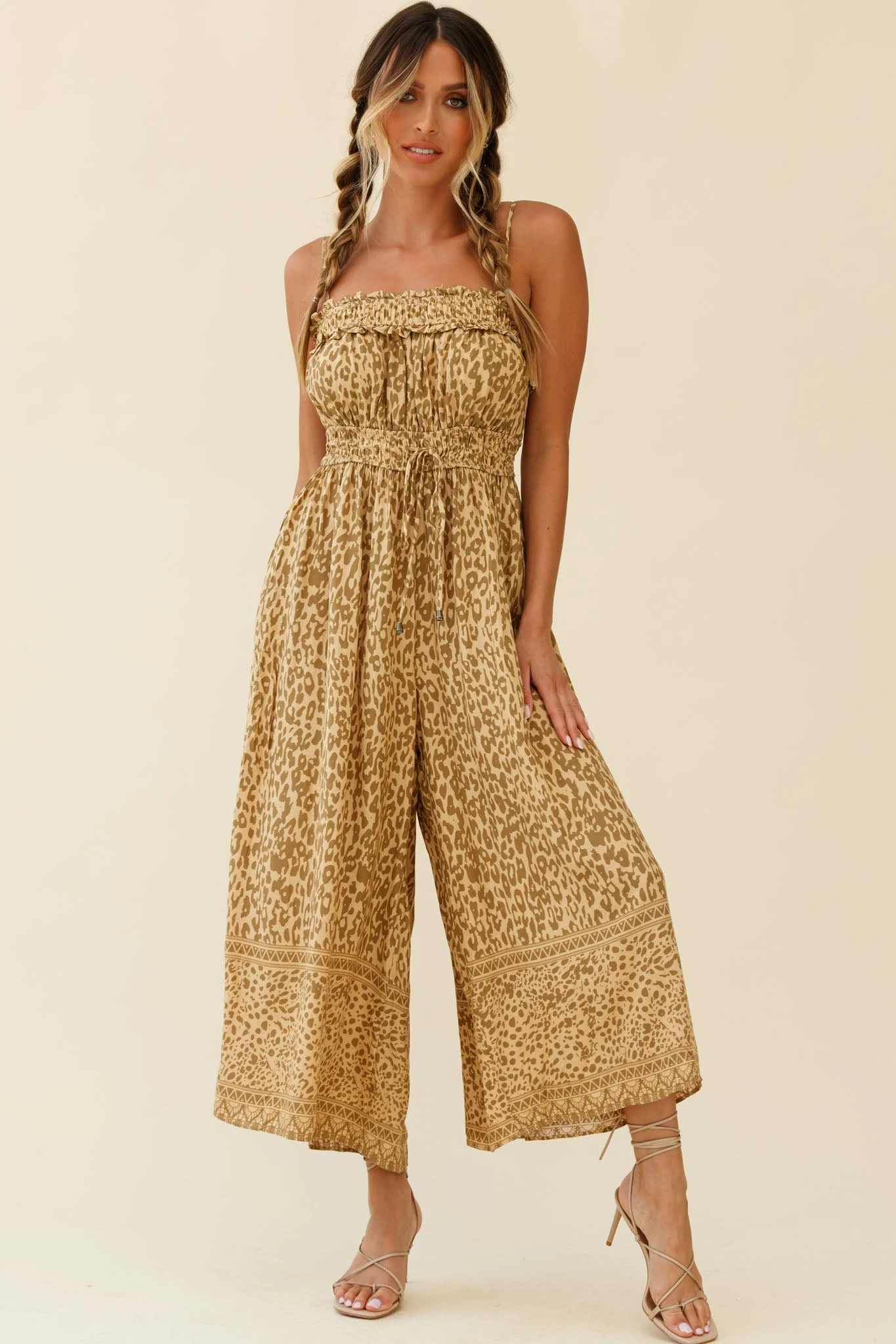 Weekend Escape Cami Strap Drawstring Jumpsuit Animal Print Khaki